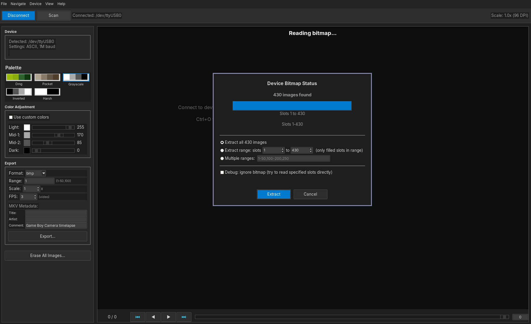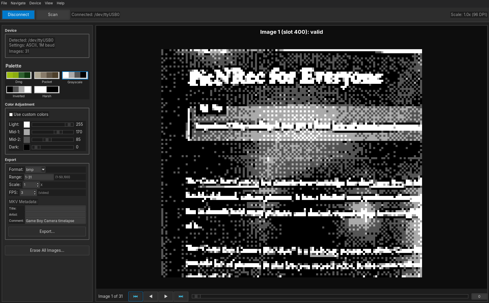 The “Game Boy Camera PicNRec” is a flashcart treatment of the Game Boy Camera. It lets you take lots of pictures. It also lets you record video. It also comes with software to get the media off of the cartridge and onto your computer. Said software is Windows-only. I run Linux. I’d rather not have to deal with Wine. To solve my (and maybe also your) problem I’ve written a multiplatform program for interacting with the PicNRec.